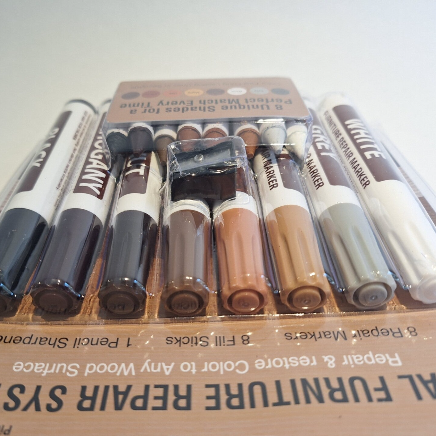 Reparatieset bestaande uit 6 of 8 kleuren bijwerkwax en bijwerkstift. Geschikt voor hout / meubelen / badmeubel etc.